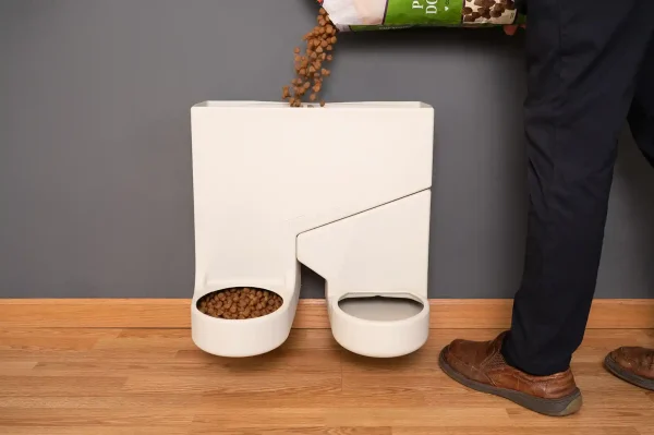 Off the floor – easy to clean under and around. Mount at any height for any size dog Holds 25 lbs of food – eliminating pantry storage Easy to clean 15 minute installation Built to last with a 5-year structural warranty and a two year limited warranty.